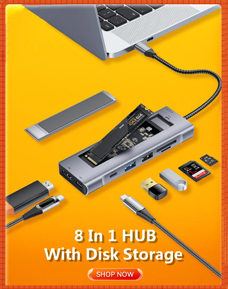 E: 8 In 1 Type-C Port: HDMI-compatible + USB3.0*2 + PD 87W + TF + SD + TYPE C + 100M RJ45
