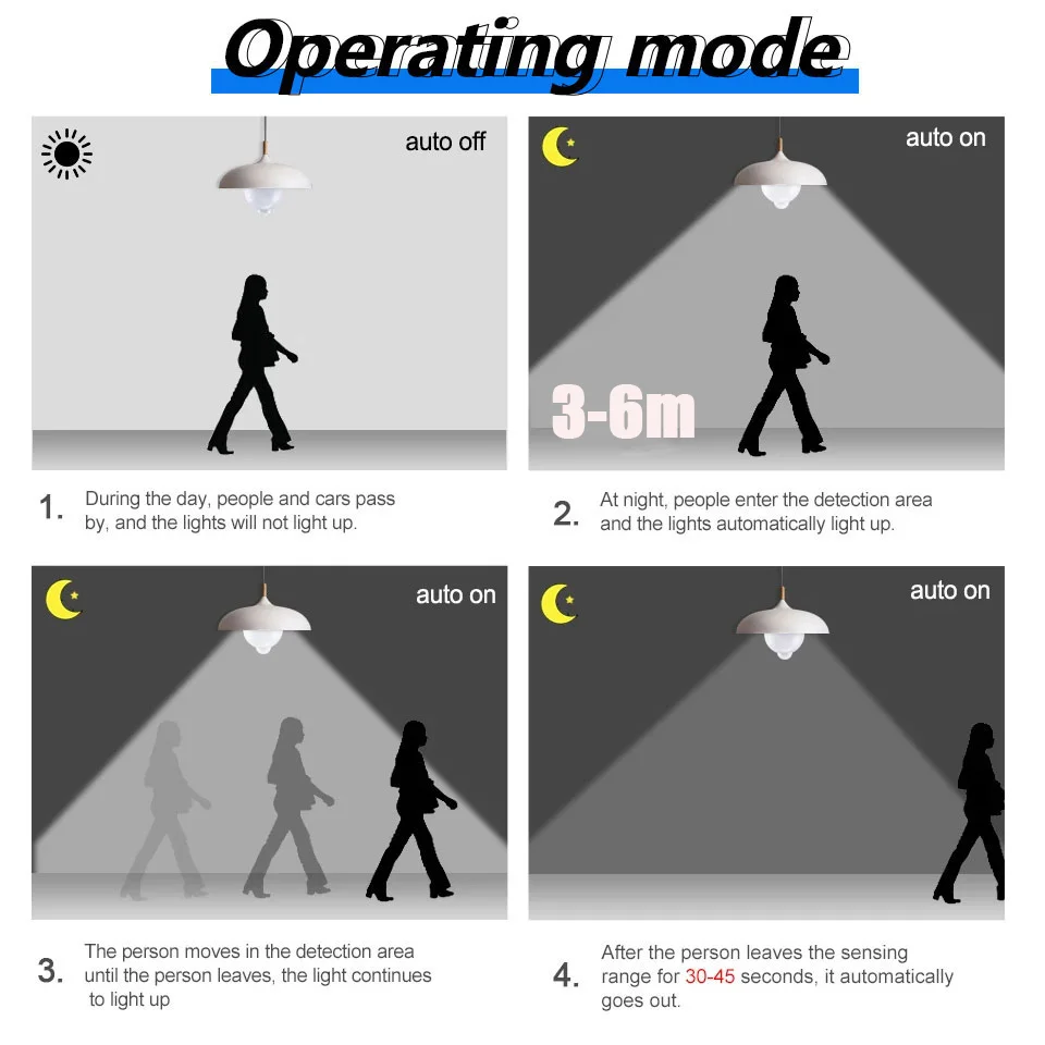 Note:LED bulbs will only light up in the dark and dusk when movement is detected and they stop working during the day