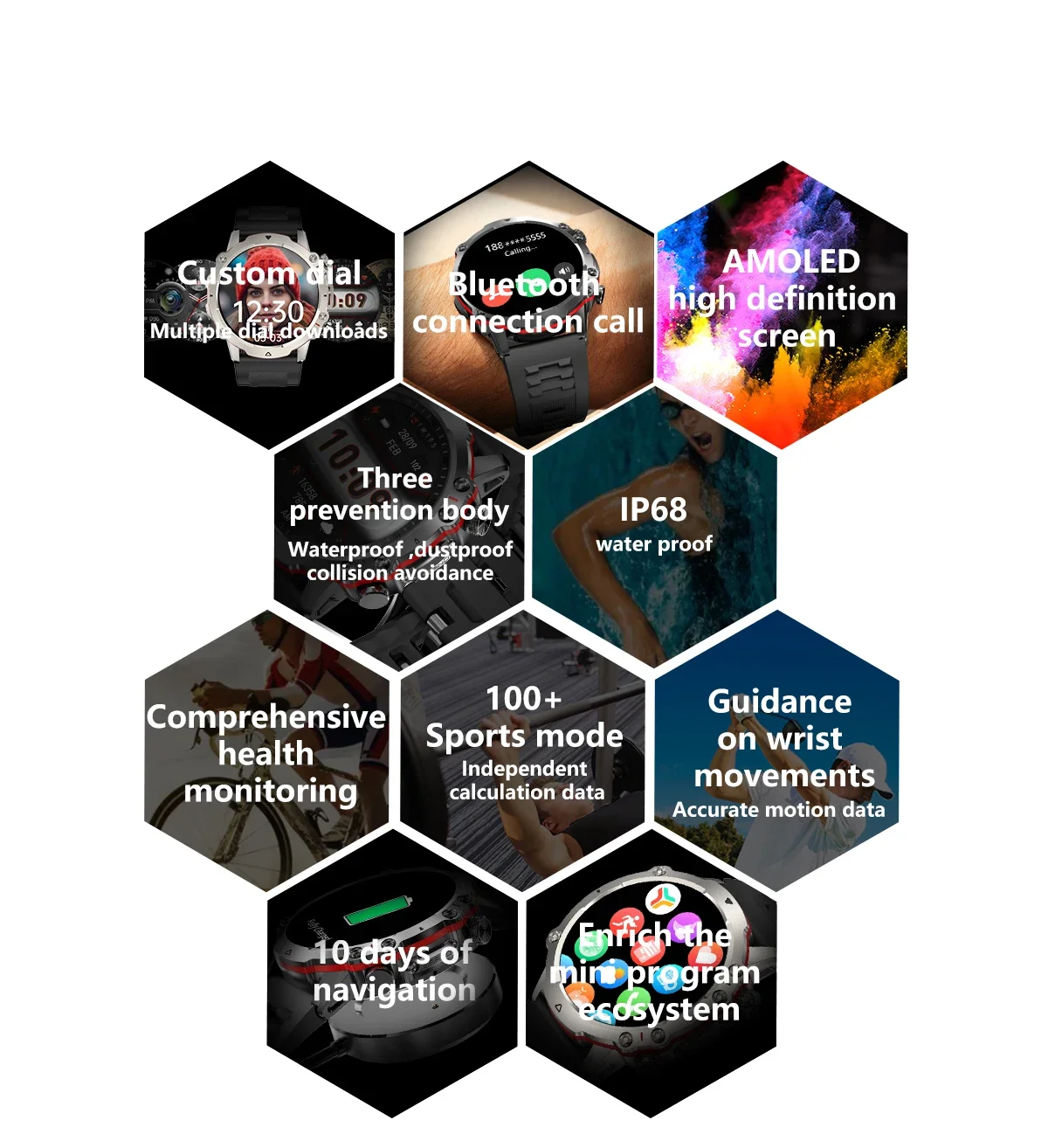 5. Multiple health monitoring (heart rate, blood oxygen, sleep, etc.) 6. Decompression and sleep assistance 8. Customized dial, Mass dial transfer at will
