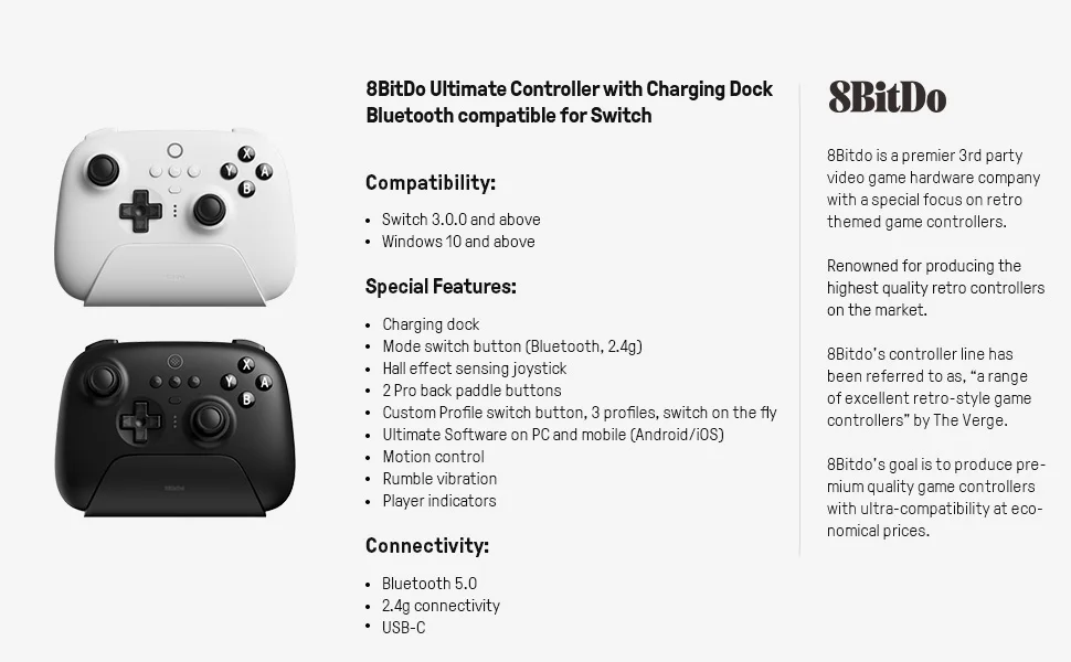 8Bitdo Ultimate Bluetooth Controller with Charging Dock Wireless Gamepad with Hall Effect Sensing Joystick for Switch Windows PC Steam