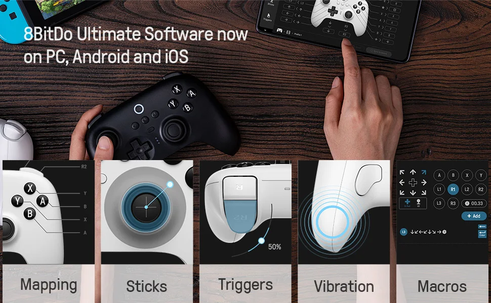 Ultimate Bluetooth controller features two Pro-level back buttons. These buttons give you more control so you don’t have to take your thumbs off the thumbsticks. With 8BitDo Ultimate Software you can assign any button function and macros, too.