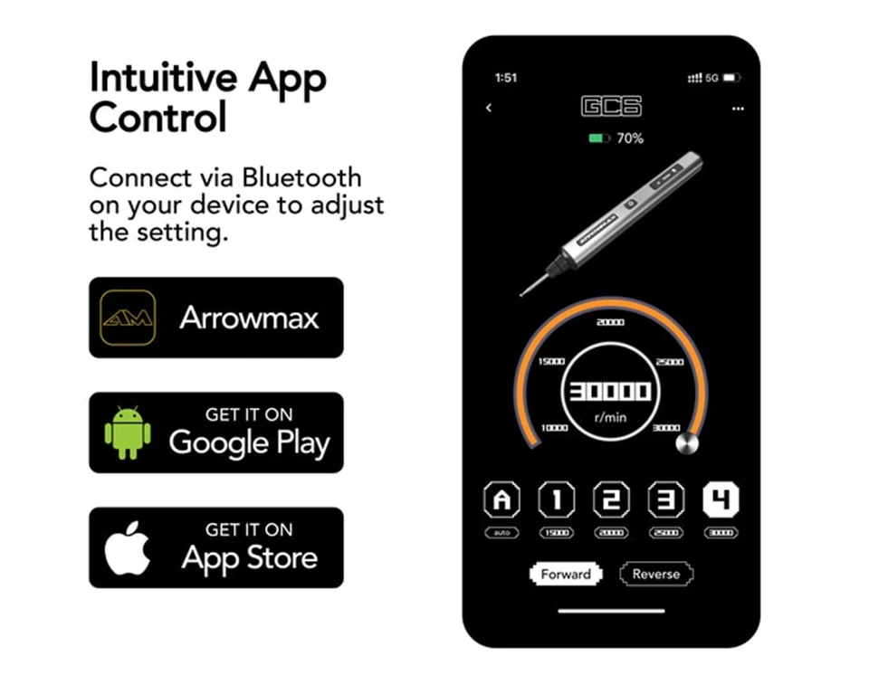 The GC6’s advanced 32-bit microprocessor which comes with 4 customised mode. You can precisely customise speed by every 1000 rpm and direction by forward/reverse of every single mode easily via ARROWMAX smartphone app that’s available for Android and iOS.