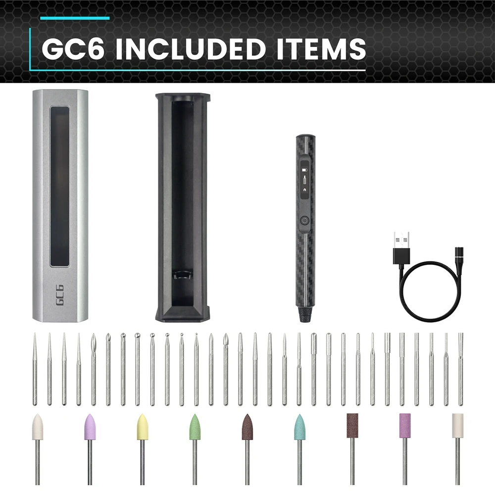 The customised data are automatically saved to the GC6. Its lowest being at 10000 RPM and highest at 30000 RPM. Customised mode builds confidence to you when you keep designing or doing work on one/same material. It reduces the time that you find or adjust the speed or direction everytime you switch on. Improving consistency and precision of your designs.