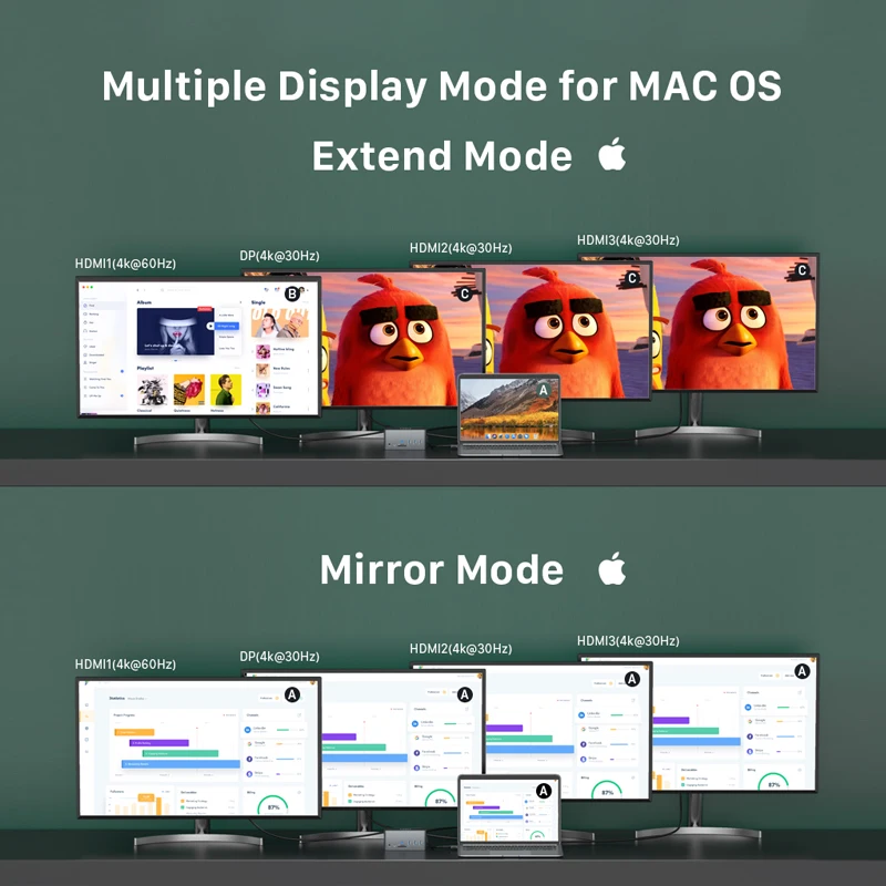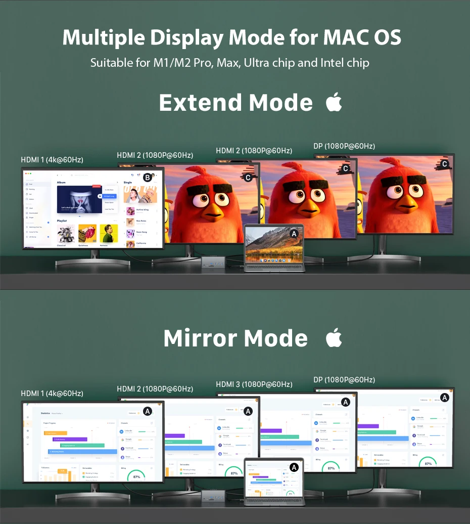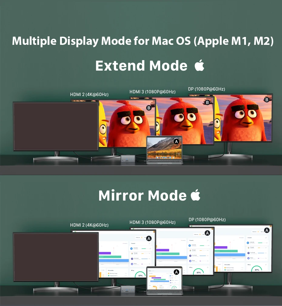 HDMI 1 output is from HOST 1 system, HDMI 2+HDMI 3+DP are from HOST 2 system, and due to the bandwidth limitation, the resolution all become 1080P. Only supports M1 MAX/M1 PRO chip series notebook computers, not support M1 chip series notebook computers 13-in MacBook Air(M1 2020)/13-in MacBook Pro(M1 2020)/Mac mini(M1 2020). Intel Core: 15-in MacBook Pro (2019/ 2018/ 2017/ 2016) / 13-in MacBook Pro (Intel Core i7 2020/ 2019/ 2018/ 2017/ 2016) / 13-in MacBook Air (Intel Core i7 2020/ 2019/ 2018). Support A to B+ C/C/C.