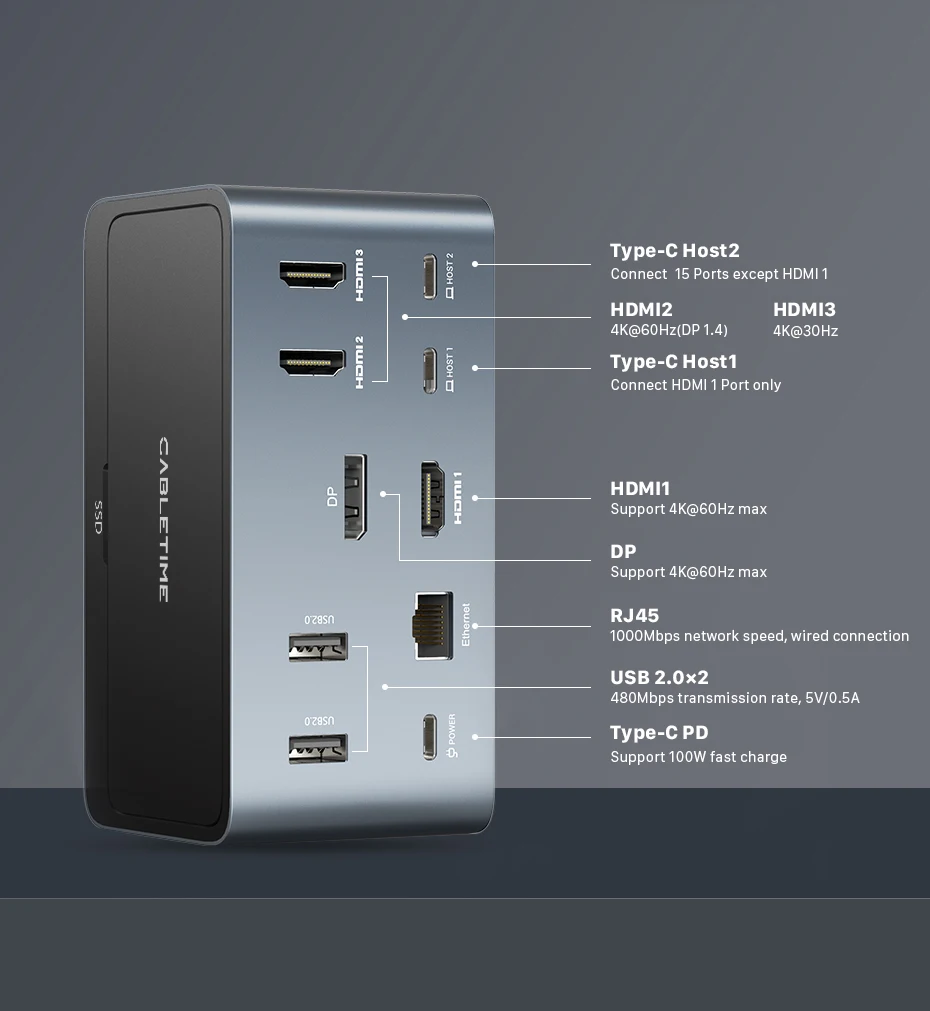 Three monitors Output: HDMI1 + HDMI2 + DP = 4K@60Hz + 4K@30Hz + 4K@30Hz