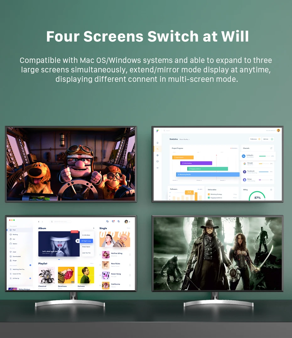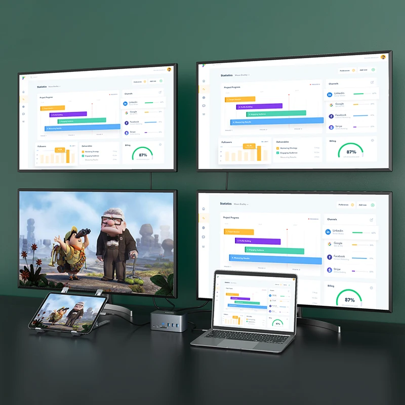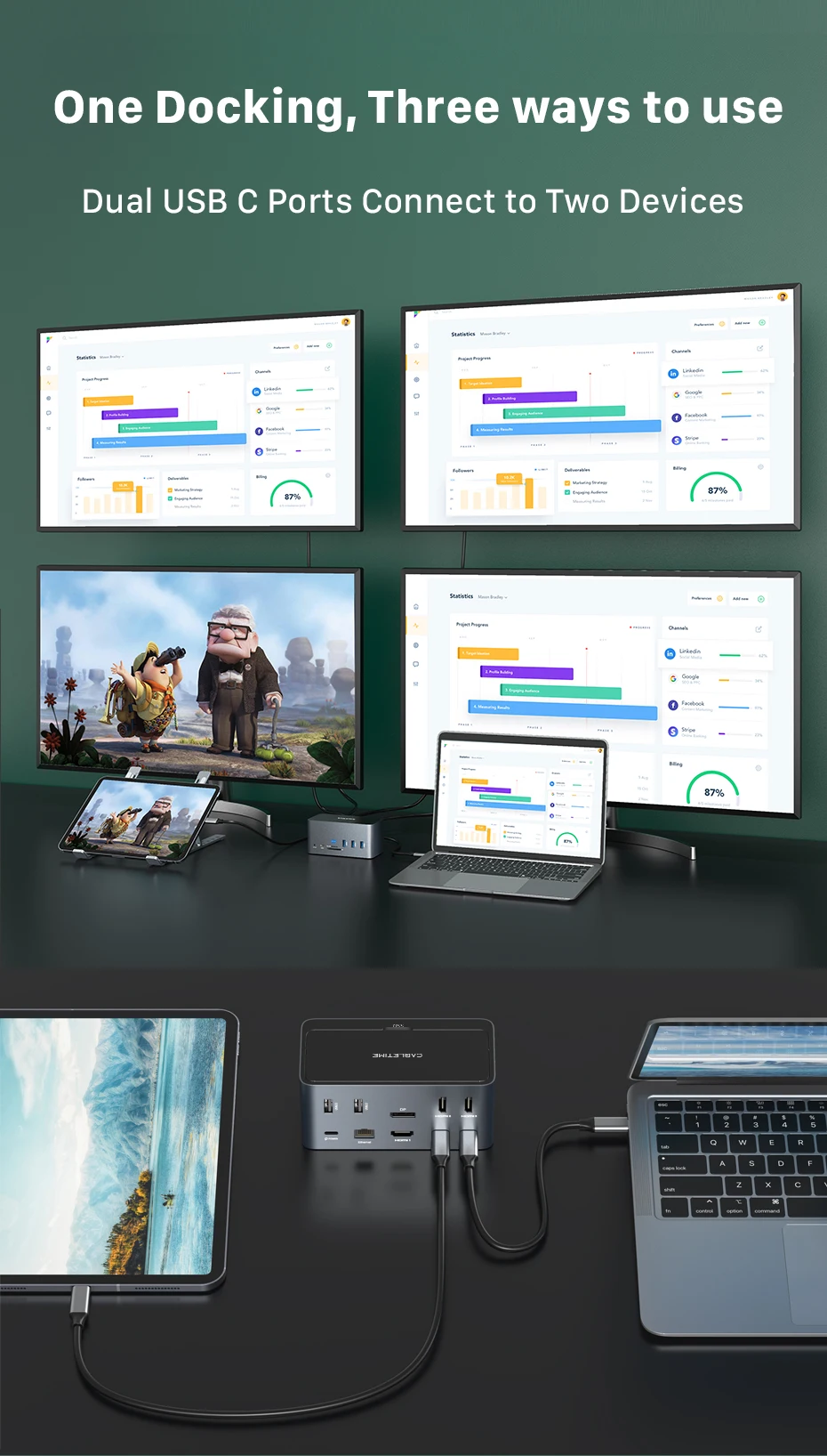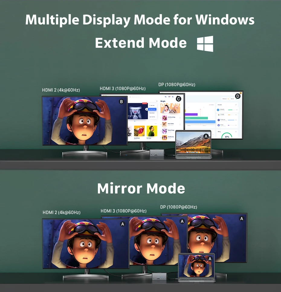 This laptop docking station allows you to connect external dual monitors, triple or quadruple monitors, with Windows laptop support A to BCDE, and for quadruple display the resolution up to 1080P.)