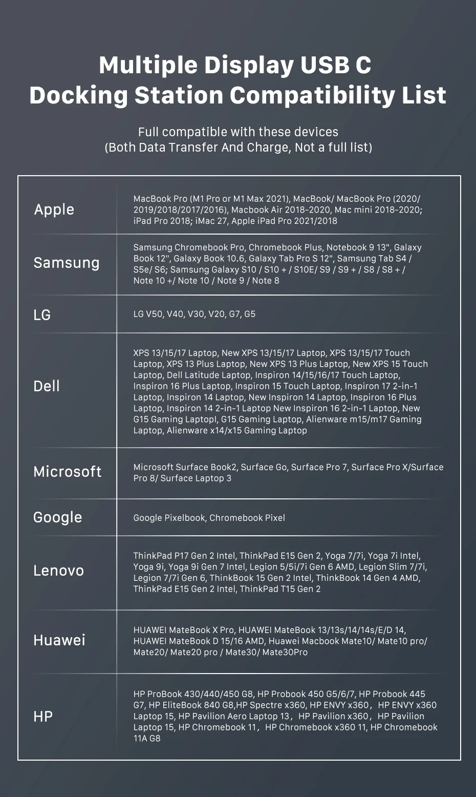 Not compatible list: Dell Inspiron 15 Laptop, Dell Inspiron 15 Laptop, HP Laptop 14s/15s/17s, HP 240 G8,HP ZBook Firefly,HP ZBook Power, HP ProBook 430/440/450 G8, Lenovo Yoga 6 AMD,Lenovo IdeaPad 1/ 1 AMD, Lenovo IdeaPad Flex 3/5 Intel/3 AMD, Lenovo IdeaPad 3i/5i Intel, Chromebook Flex 5,Chromebook 5i Intel,Chromebook Duet 3,Chromebook Flex 3i,Lenovo K14 AMD/Intel,ThinkBook 15 Gen 3 AMD,ThinkBook 13s Gen 2 AMD , ThinkBook 13s Gen 2 AMD,ThinkBook 15 Gen 4 AMD,13-in MacBook Pro (M1 2020) / 13-in MacBook Air (M1 2020)