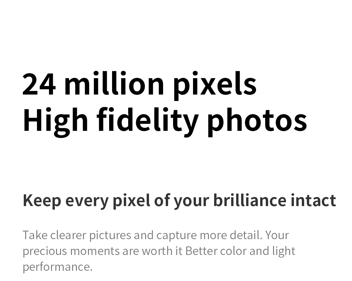 24 million pixels High fidelity photos : Keep every pixel of your brilliance intact Take clearer pictures and capture more detail. Your precious moments are worth it Better color and light performance.