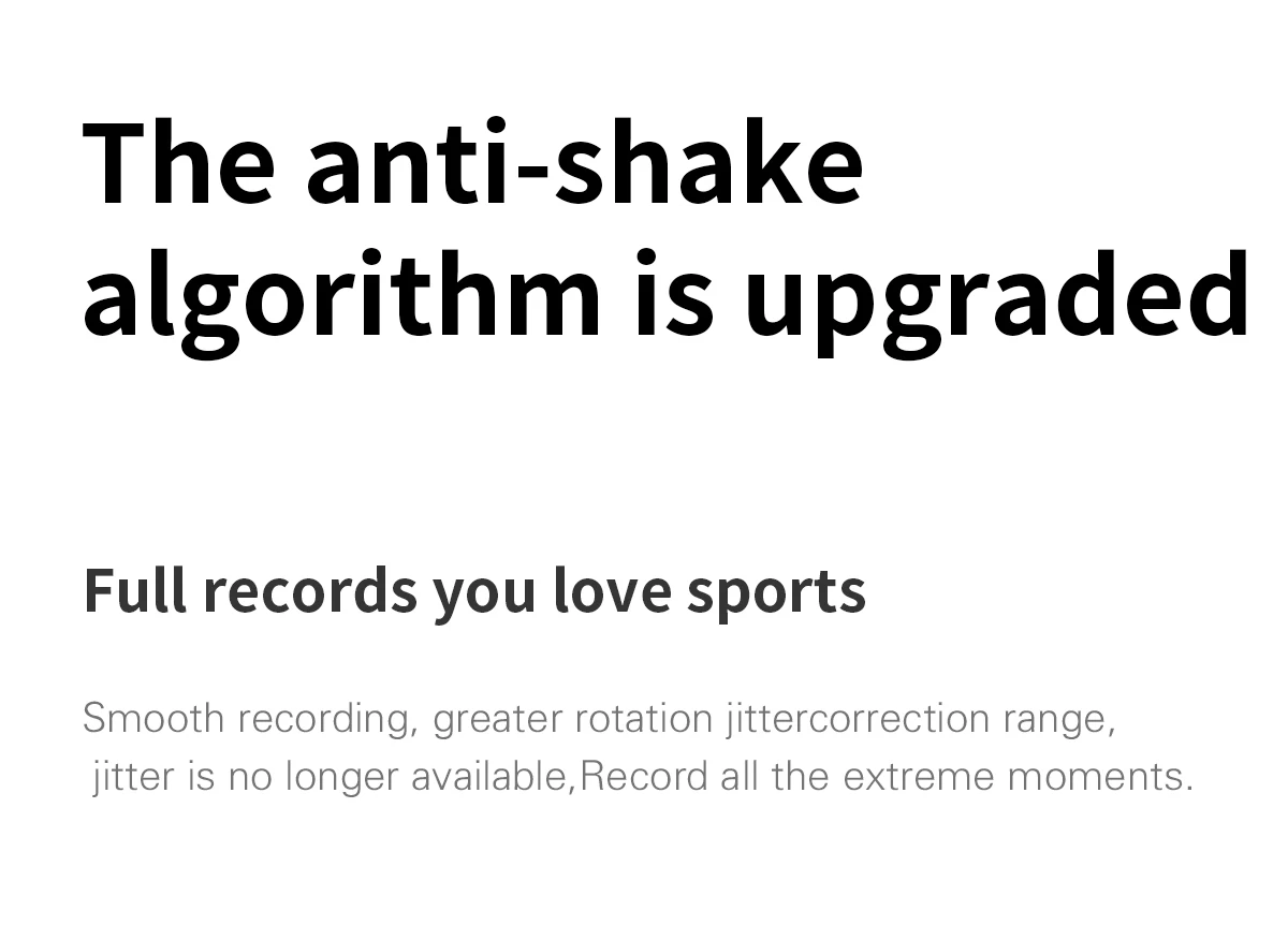 The anti-shake algorithm is upgraded :Full records you love sports Smooth recording, greater rotation jittercorrection range, jitter is no longer available, Record all the extreme moments.