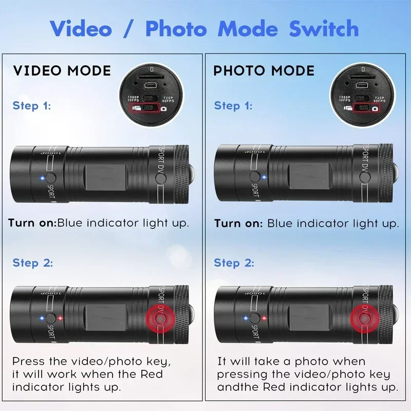 1. Two video mode sports camera: High quality 60 frames of machine video in 720p video mode and 30 frames of machine video in 1080p video mode.
