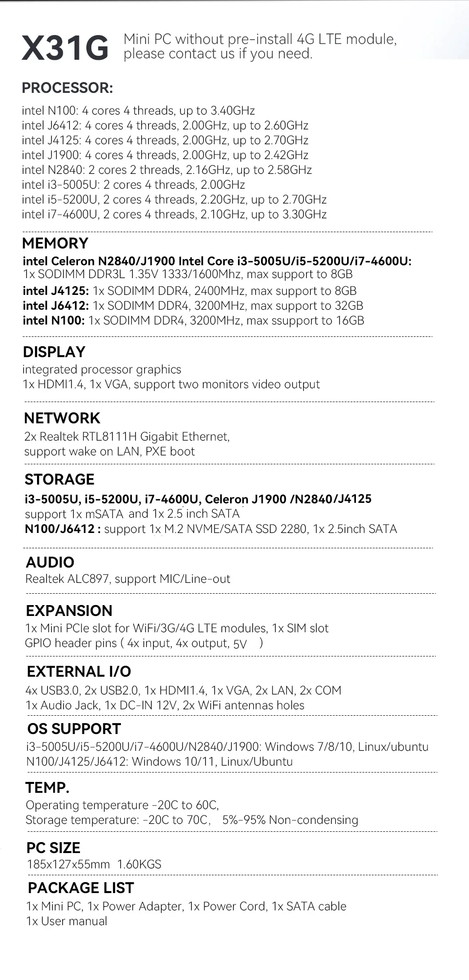 Processor Model | Intel N100, i5-5200U, i7-4600U, i3-5005U, Celeron J6412, J4125 |