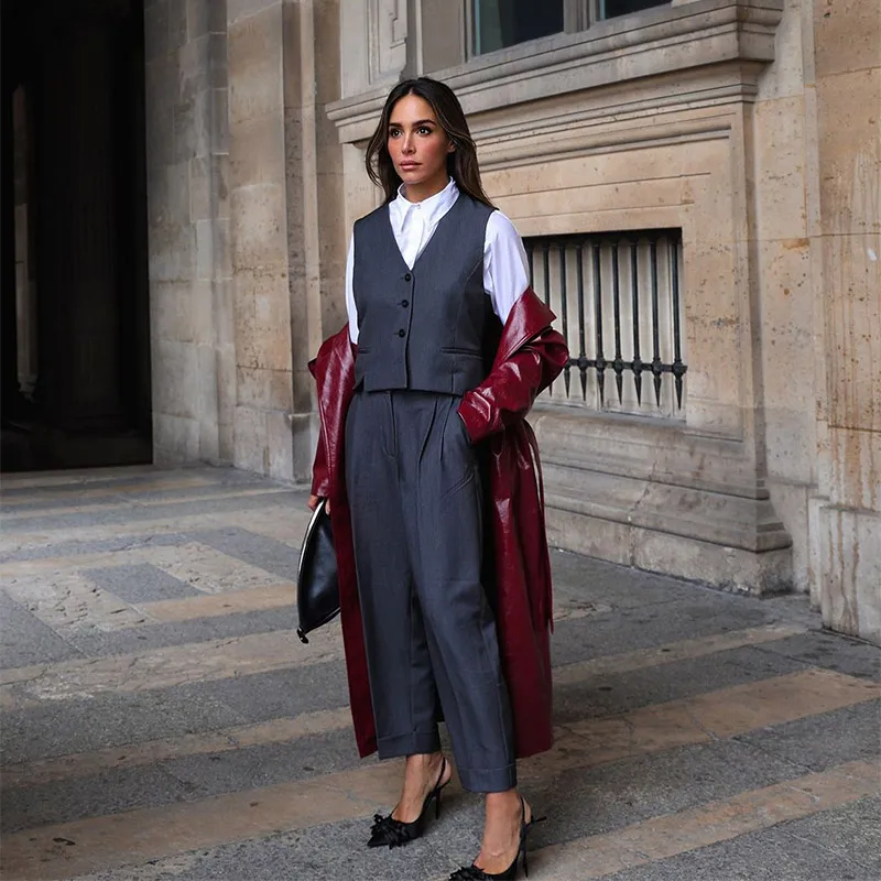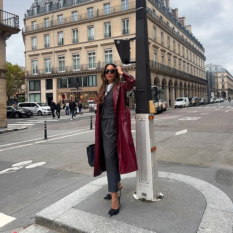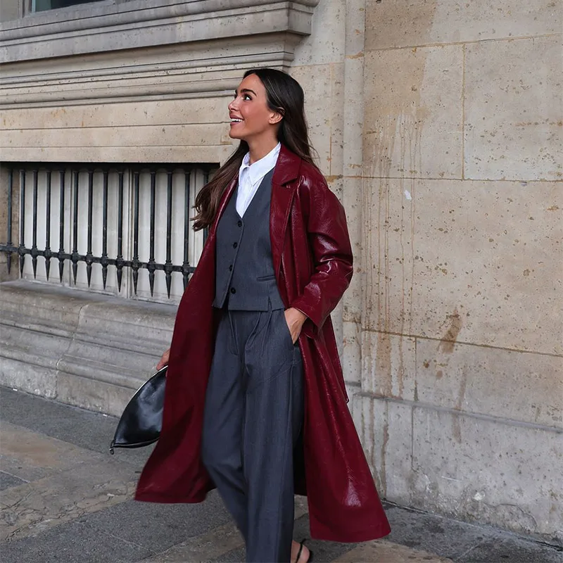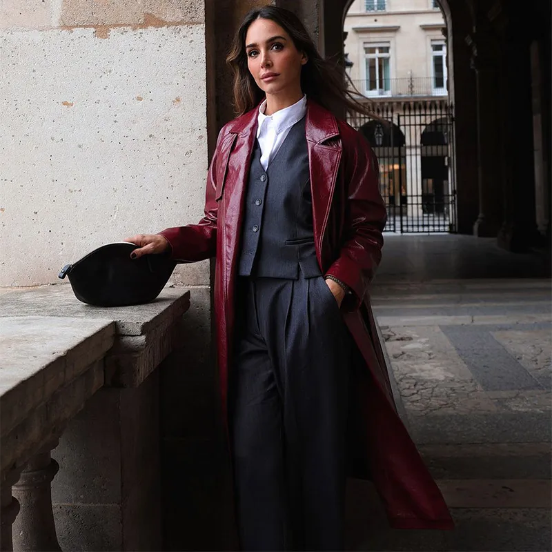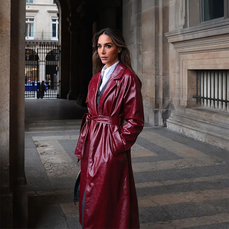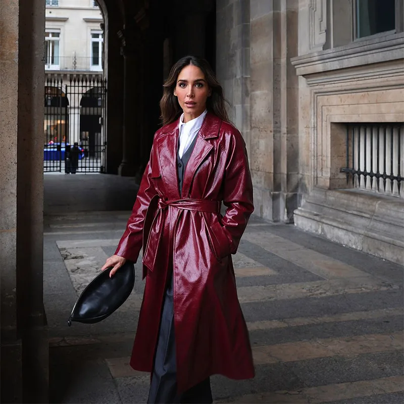 Model Number | 2024 Chic Burgundy Patent Leather Overcoat With Belt |