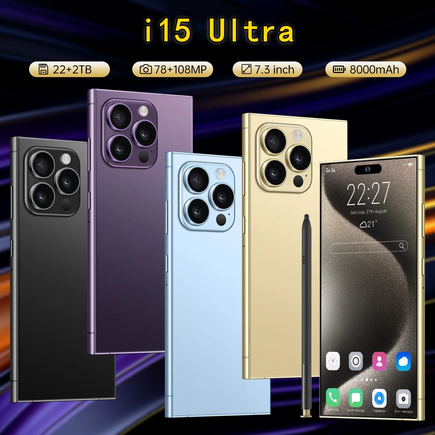 i15 Ultra Original Android 14 Mobile Phones 7.3 Inch Unlocked SmartPhone 78+108MP Camera Dual Sim 22GB+2TB 8000mAh 5G Celular