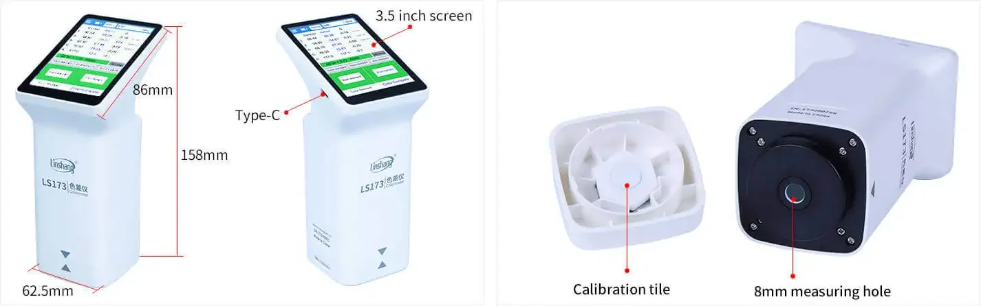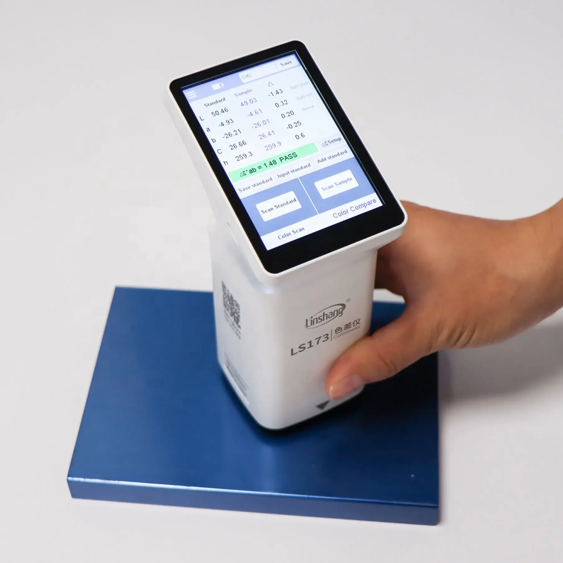 LS173 is a portable multifunctional colorimeter with D/8° (SCI) optical geometry design. The color analyzer is equipped with a 3.5-inch IPS color capacitive touch screen, providing an excellent operating experience. The colorimeter integrates multiple natural color charts, and can quickly match the measured color to the closest color codes. The color difference meter also has a color difference comparison function, supports a variety of standard color addition methods, the color difference threshold can be set. The color difference formula can be flexibly selected, which can realize rapid QC testing.