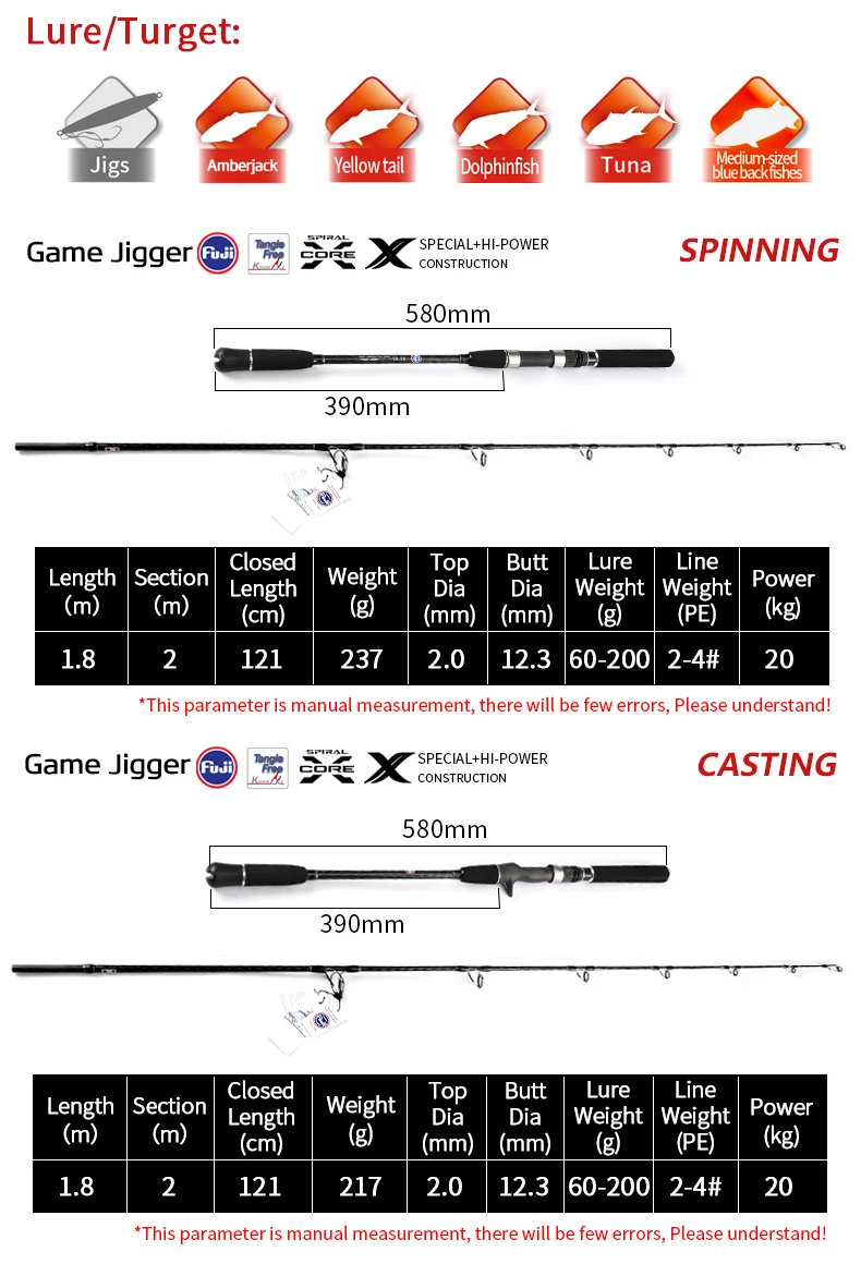 Madmouse Game Jigger Spinning 1.8M Power:20kg Lure WT:60-200g Line WT:pe2-4 Weight:237g
