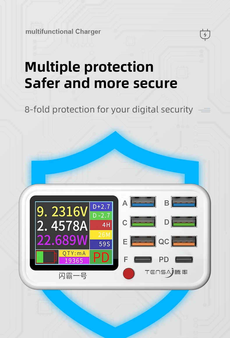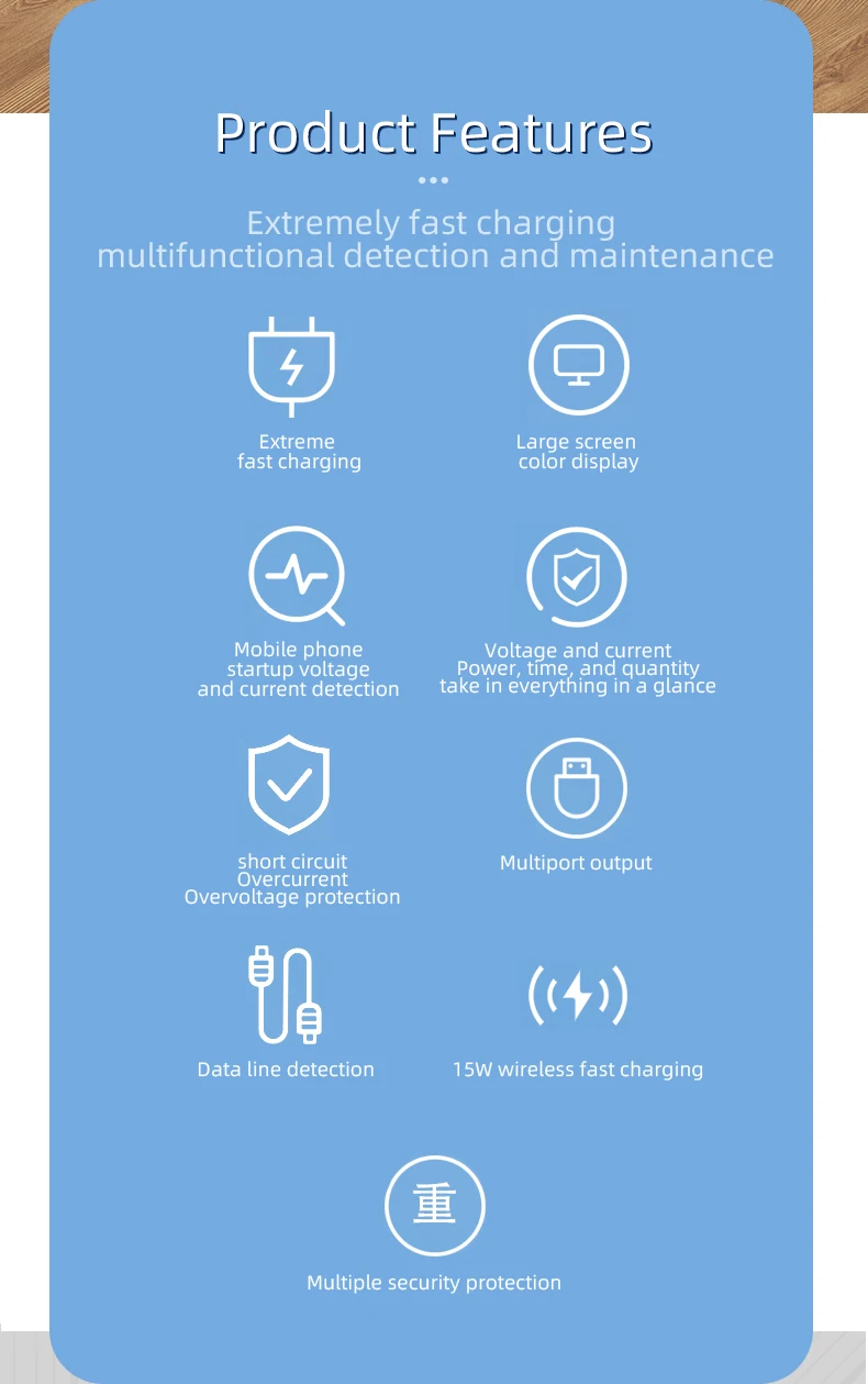 Fast charging, Large screen color display, Mobile phone startup voltage and current detection, Repair of burning short circuit, Short circuit overvoltage protection, Multiport output, Data line detection, 10W wireless fast charging, Multiple security protection.