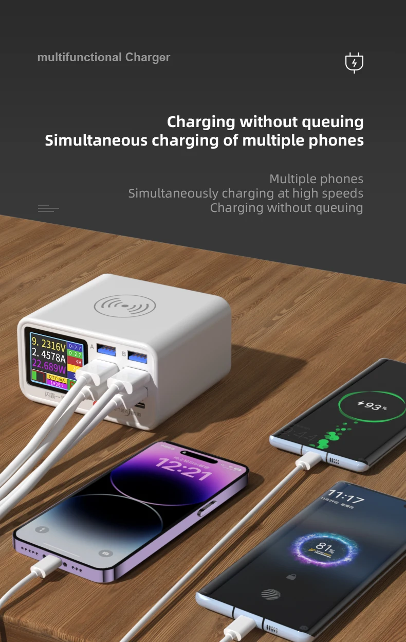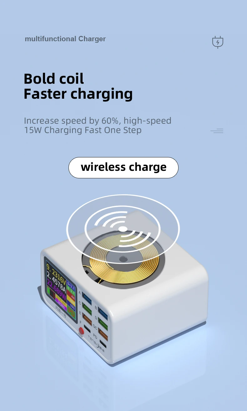 Multi-Function 8-Port PD Rapid Fast Charger Mobile Phone Current Data Line Detection Wireless Charging for iPhone Samsung Xiaomi