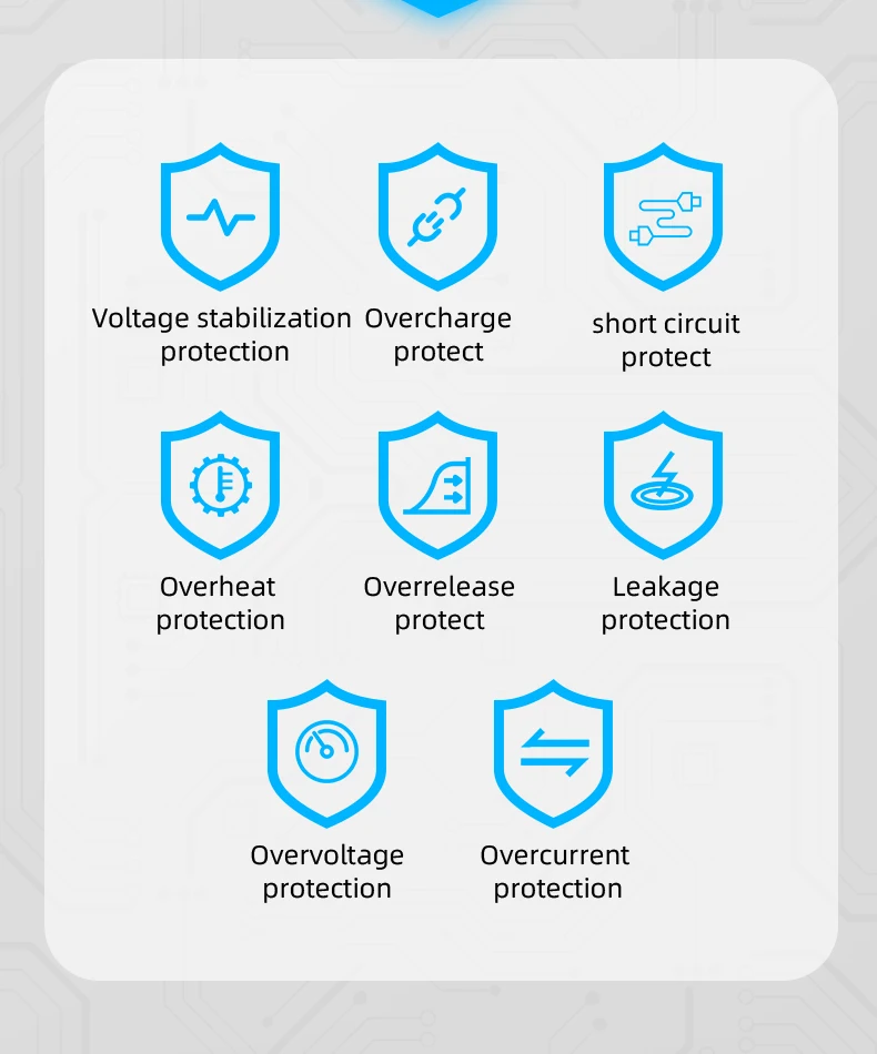 Voltage stabilizing protection, Overvoltage protection, Short circuit protection, Leakage protection, Overheat protection, Over discharge