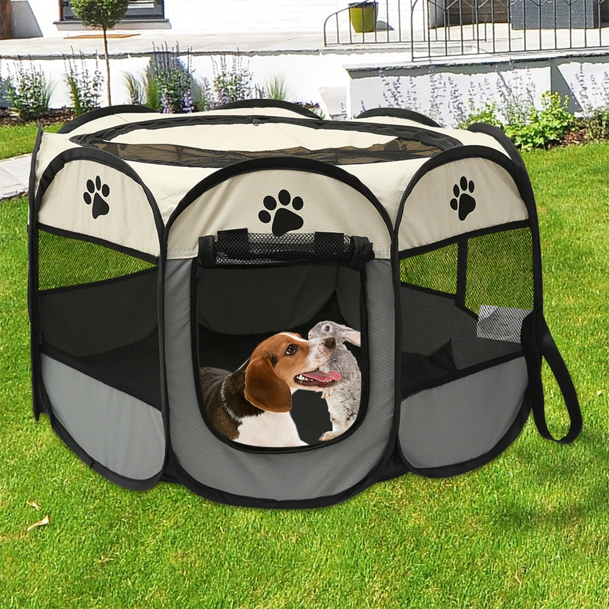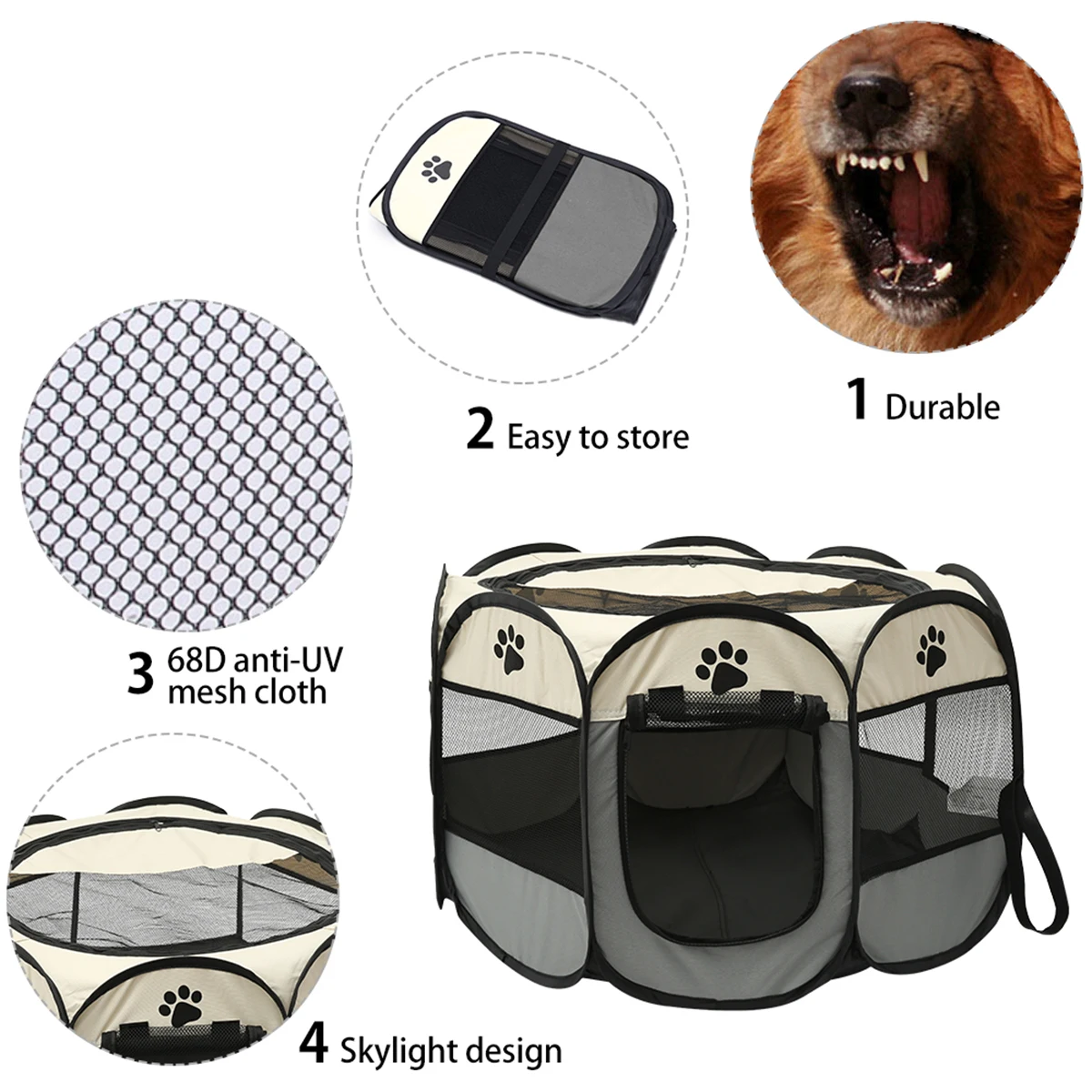 Outdoor Travel Pet Kennel: This travel pet kennel comes with a storage bag with handles and fixing nails, you can fold it and store it to take it with you for use on the go, so that your dog can have a comfortable kennel even outdoors.
