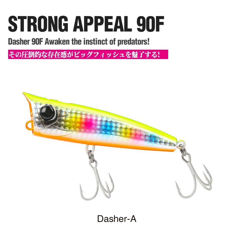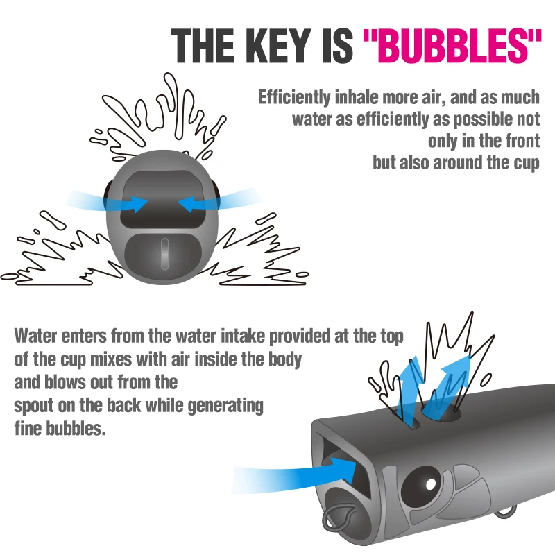 90F Popper generates more bubbles by taking in more water. At the same time, drawing glittering bubbles on the trajectory of the lure’s swimming, enhanced its attractiveness in water.