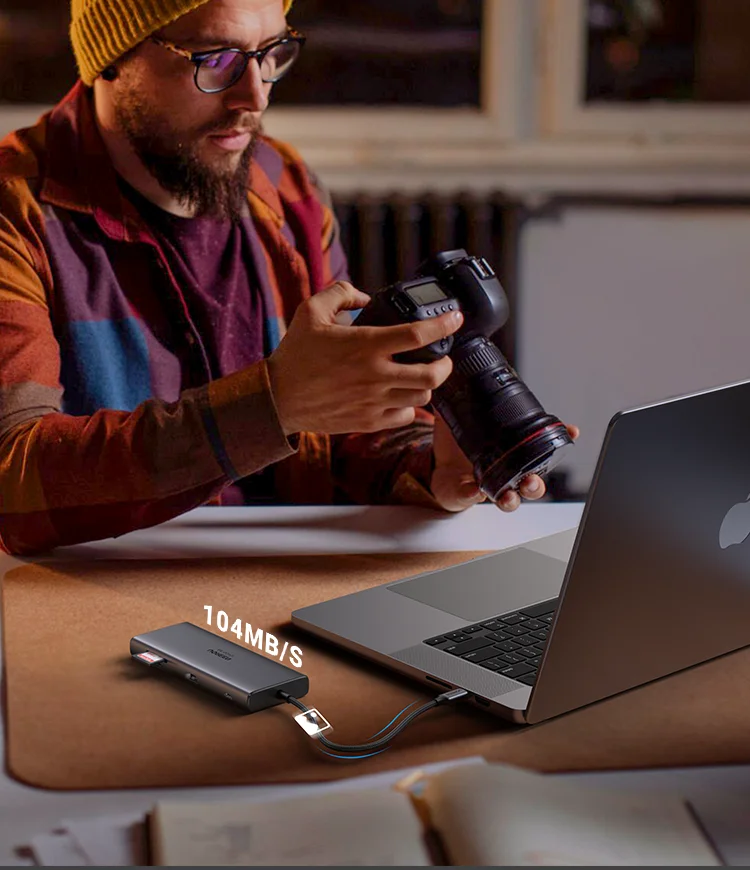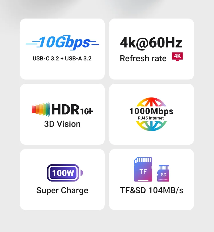 1x USB-C 3.2 10Gbps + 1x USB-A 3.2 10Gbps + 4K@60Hz HDMI + 1000Mbps RJ45 + PD100W + 104MB/s. SD/TF + 2*USB3.0 5Gbps