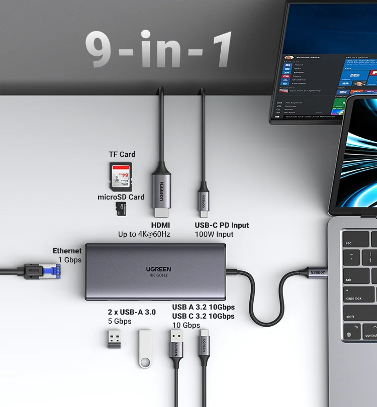 (9) 5Gbps 5-in-1: 4K@30Hz HDMI + PD100W + 3xUSB-A 5Gbps;