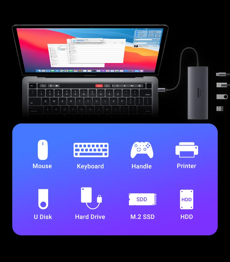 If your device’s USB-C port is DP1.2 version(4K@60Hz supported), when using this UGREEN HUB, the resolution will automatically adapt to 4K@30Hz.