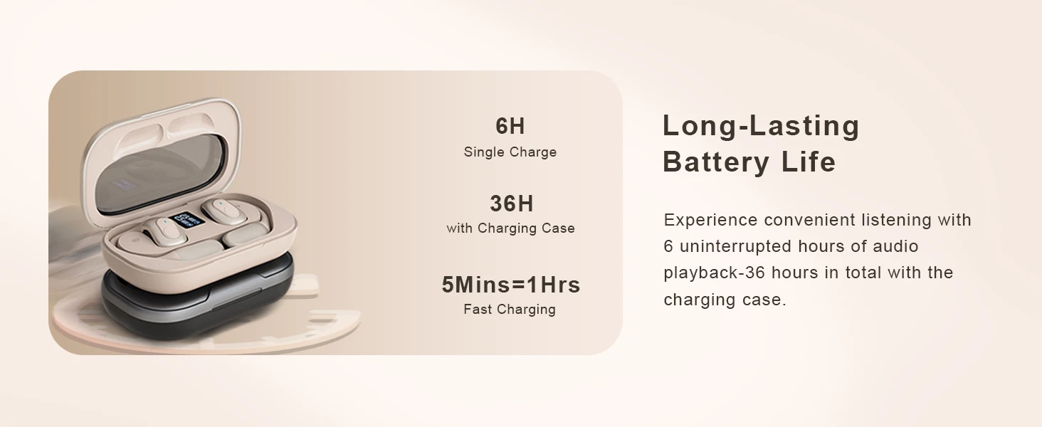 Up to 36 Hours of Playtime: Bluetooth headphones boast a high-density lithium battery and the latest Energy Lock technology, offering 6-8 hours of continuous playback per charge. With the charging case, enjoy an additional 30 hours, totaling up to 36 hours of playtime. Plus, with fast charging technology, get 1 hours of playback after just 5 minutes of charging.
