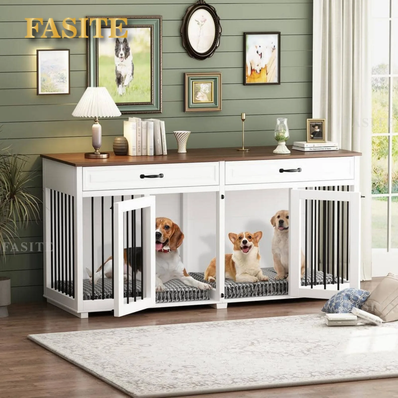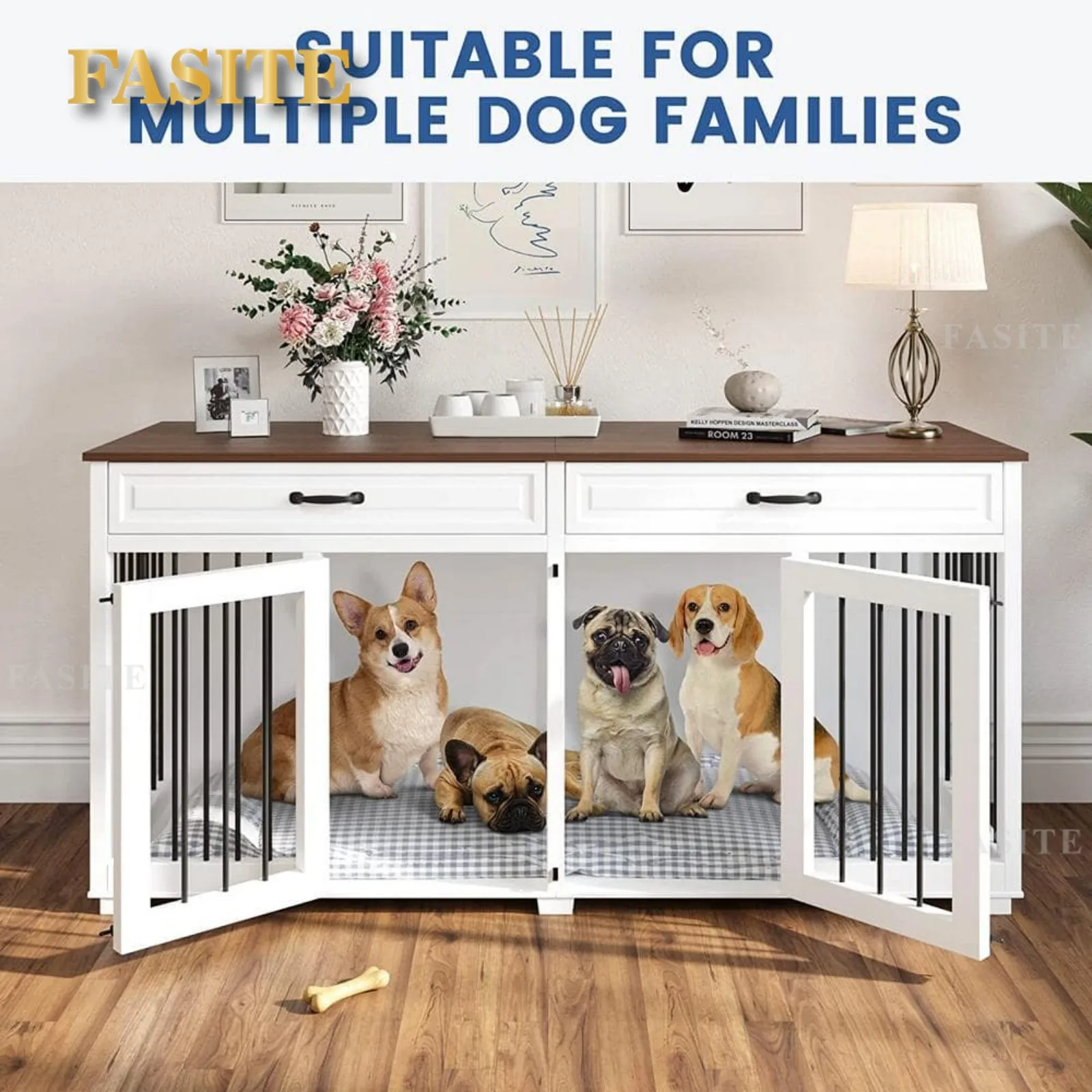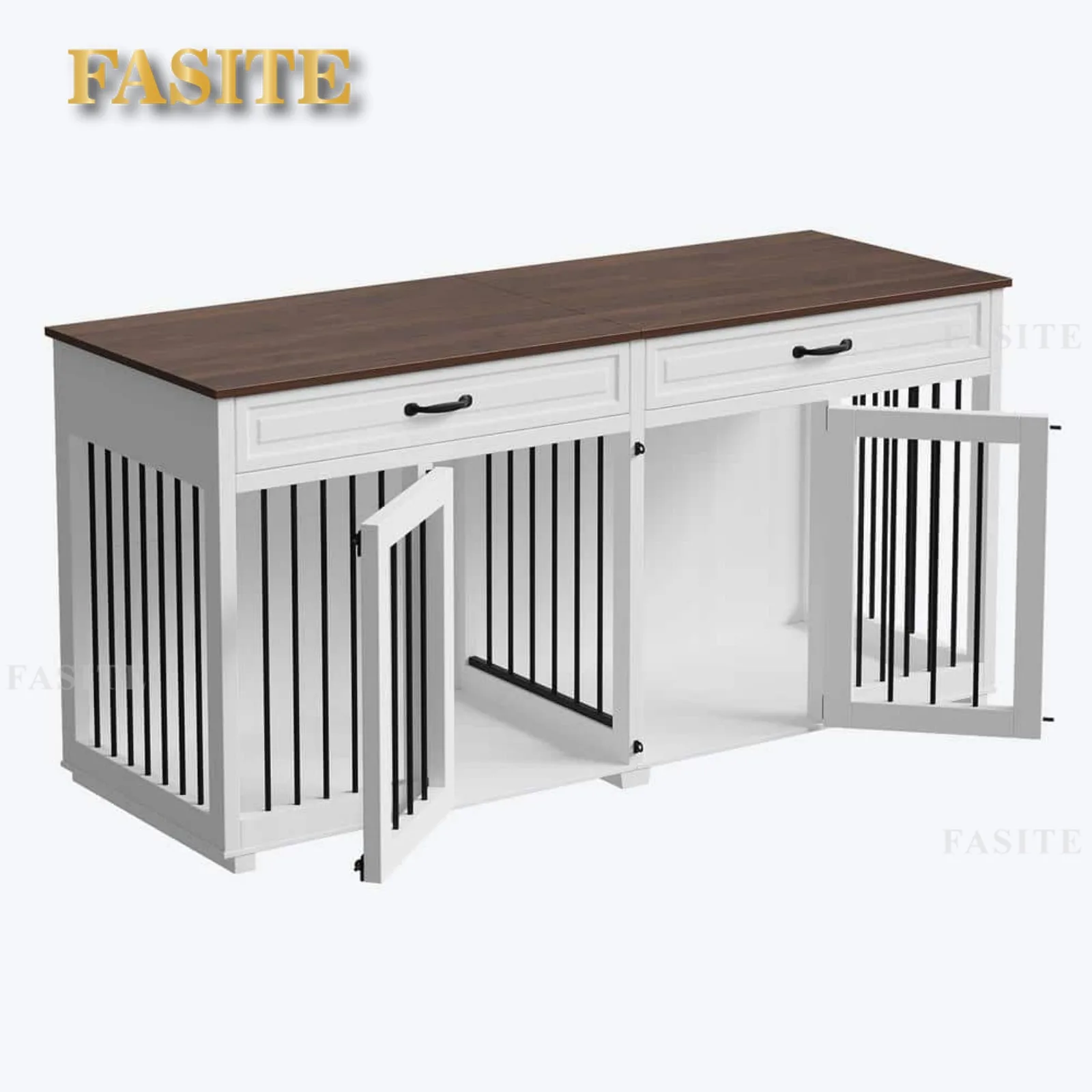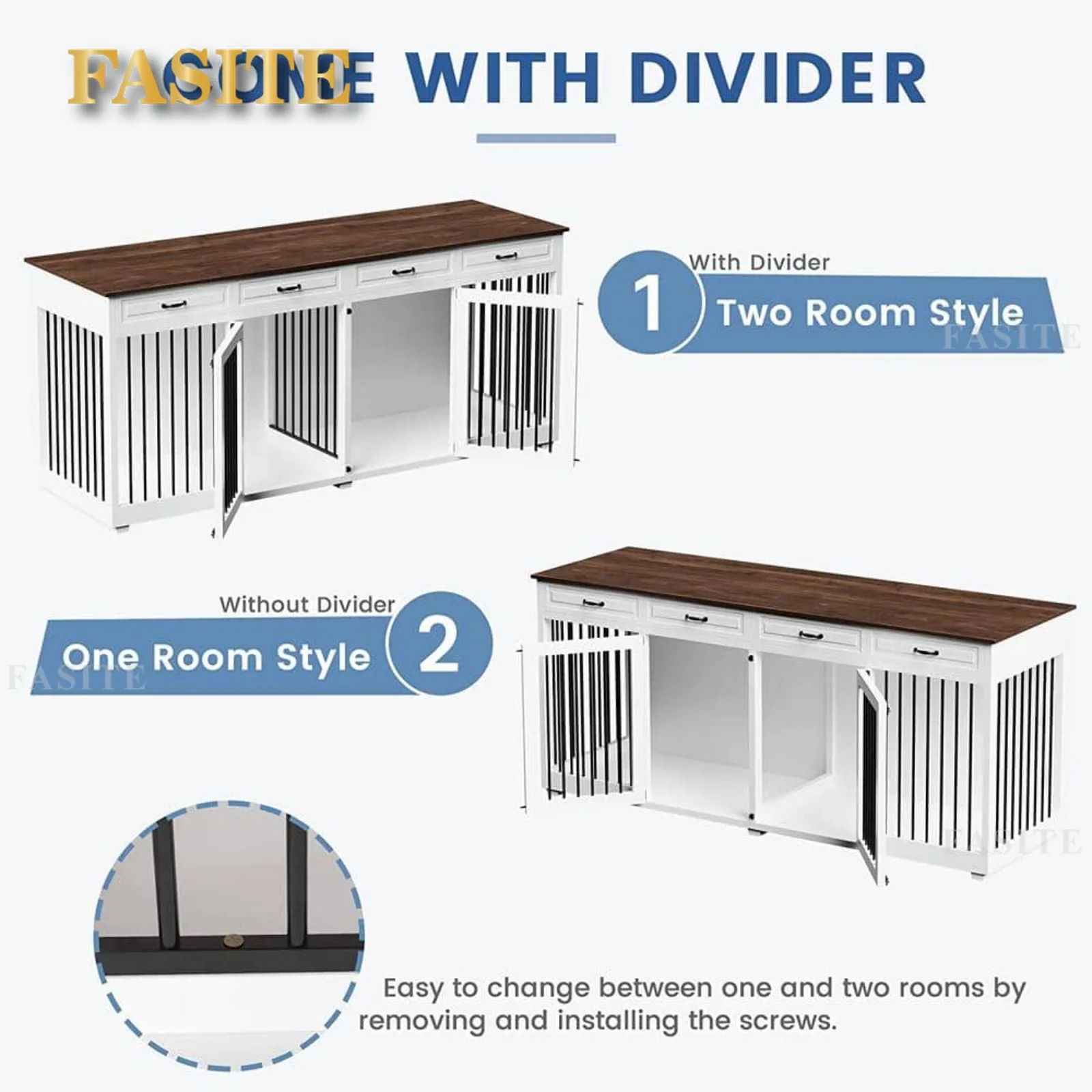 WHY CHOOSE OUR DOG CRATE. A unique style from the home depot. Unlike the traditional small dog crate on the market, it is perfect for large dogs or multi-dog families. You don’t have to worry if it’s 2 dogs with different temperaments. You can install the divider to turn it into 2-rooms or you can even install curtains to let them stay in their own separate space altogether. Putting aside its functionality, it also looks great. White and Walnut create a simple and warm atmosphere that will add beauty to any corner.