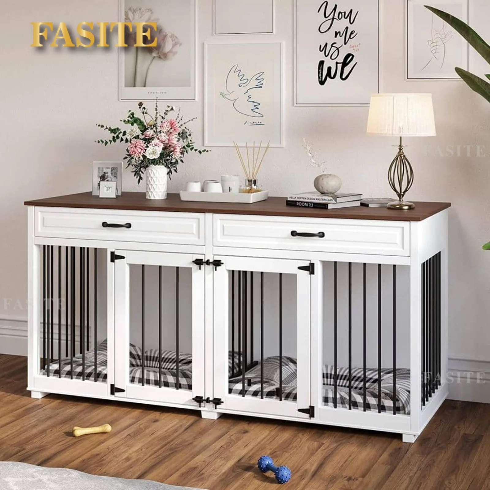 Designer-style dog crate kennel for indoor can add aesthetics to any corner, the white and walnut color scheme is simple and atmospheric and can be combined with any decoration style, making it ideal for tv cabinets, display stands and plant stands